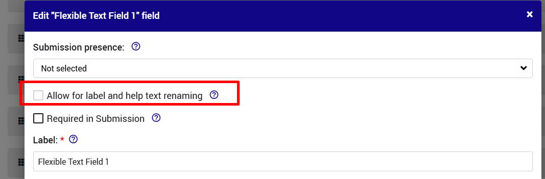 This flexibility extends to fields of types such as Text, Number, Date, File, Link, Static Text and User. - Click the box for "Allow for label and help text renaming."