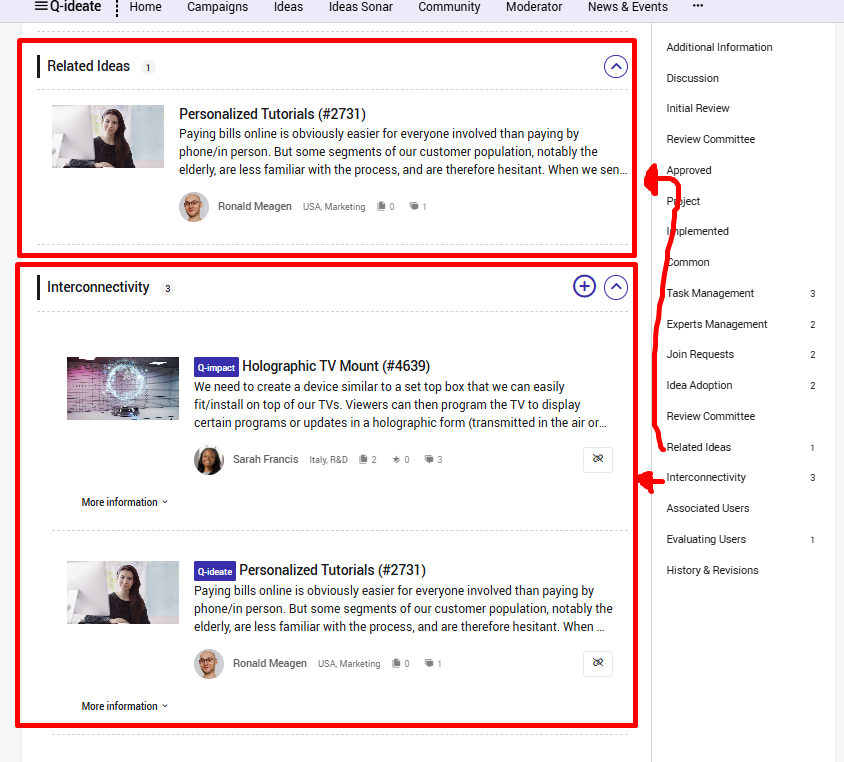 | Interconnectivity | Indicate there is a connection between 2 entities (similarity, inspiration, relevancy). | Connect between entities across different subsystem OR the same subsystem | N/A | Can be defined as many-to-many, one-to-many, or one-to-one | There will be a link from each one of the entities to the other one, on the dedicated section on the idea page. The entities will stay in their current state. | Type of relationship. What data from the "other entity" should be displayed on the idea page, and available on cross-systems reports | Need to be activated by CSM/Support. No charge involved. |