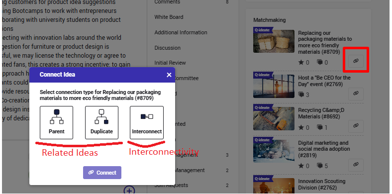 | Related Ideas | Indicate there is a relationship between 2 entities when 1 is the main/leading/parent one, and the other ones should not continue independently in the process. | Connect between entities within the same subsystem | When connecting which idea is the parent idea and which one if the child idea | A parent can have multiple children. Every child idea can have only one parent. | The "child" idea will move to "Duplicated" state. There will be a link from each one of the entities to the other one, on the dedicated section on the idea page. | N/A | Can be activated from the subsystem setting by sysadmin/subsystem admin. |