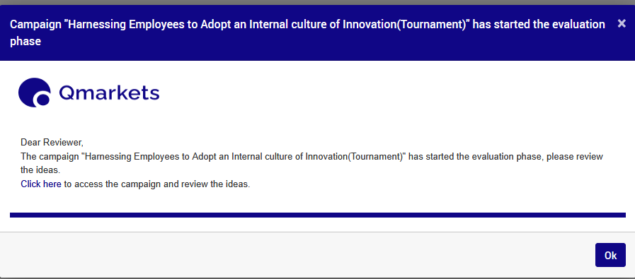 The subject and content of email is maintained by Qmarkets team. it contains a link to the page from where the users can rate/evaluate the ideas.