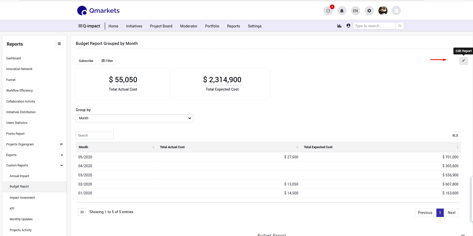When viewing a report on the Reports page, an edit icon is displayed that allows you to make changes directly.